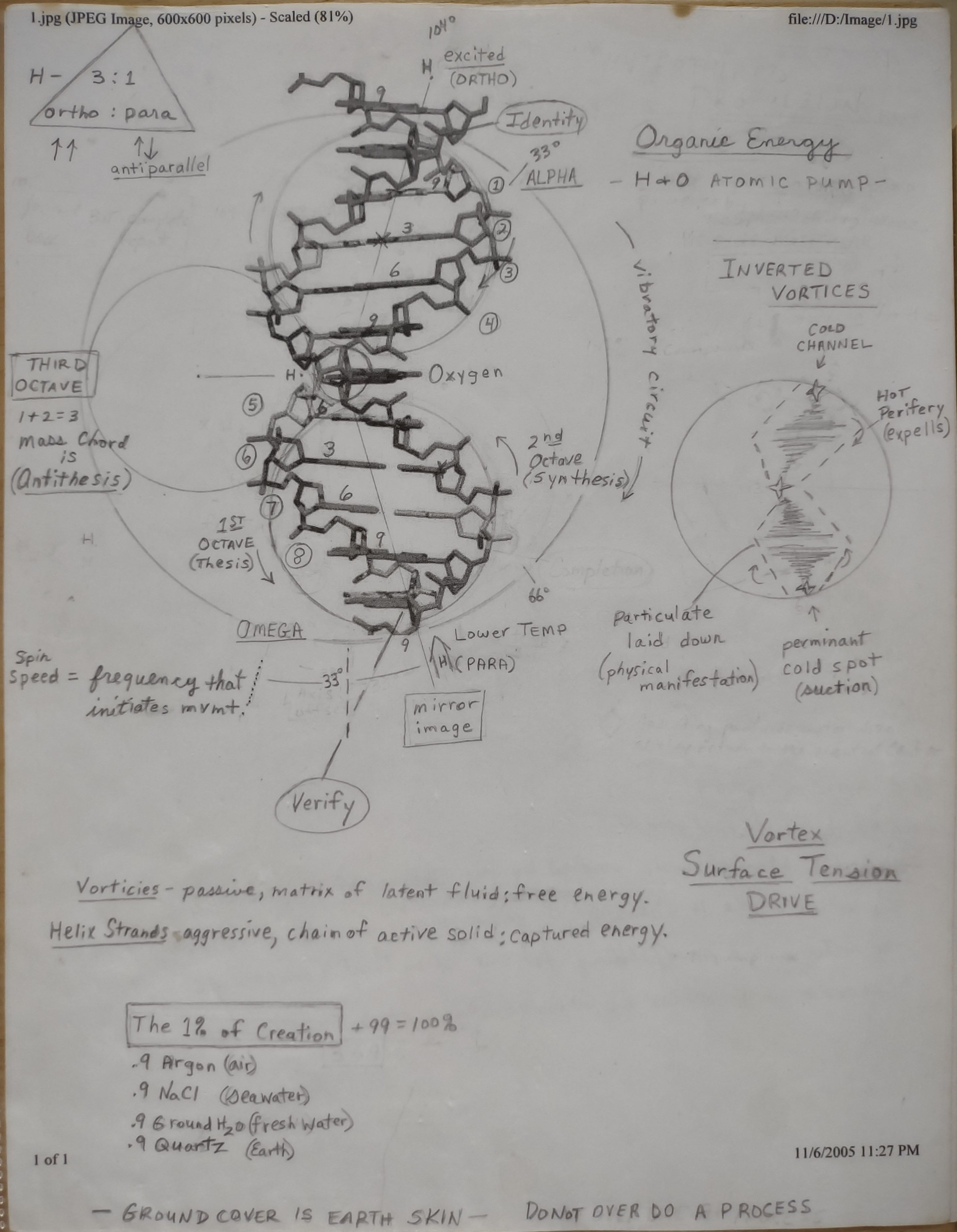 Larz drew four circles that showed the hole (neutral center) and its three parts. A double octave of thesis and synthesis worked together. They ran the nucleobases that appeared to act like a serpentine belt. The manufactured antitheses provided for a balanced accord. It was a facilitator that linked the etheric dimensional transferences. Physicality was achieved and maintained through the efforts of the three octaves.